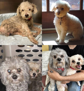 Your contribution will help us continue to provide vital medical care for our rescues like Russel, Gracie and Blondie. Top: Russel before left, after right. Bottom: Gracie and Blondie before left, after right